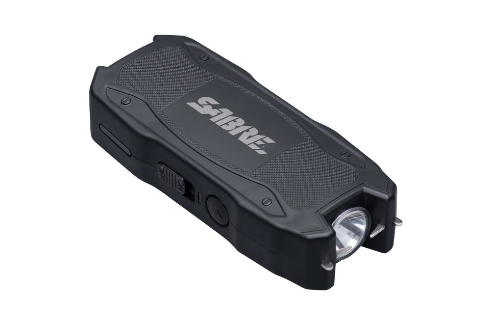 The SABRE Stun Gun with Flashlight and Battery Strength Indicator delivers a 1.552 microcoulombs (µC) charge. Features a battery strength indicator for increased reliability, a 120-lumen flashlight, and a safety switch. Charging cable and belt holster included.